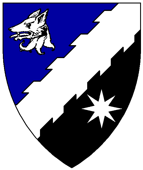 | Blazonry: | Per bend sinister azure and sable, a bend sinister raguly between a wolf’s head erased and a mullet of eight points argent |